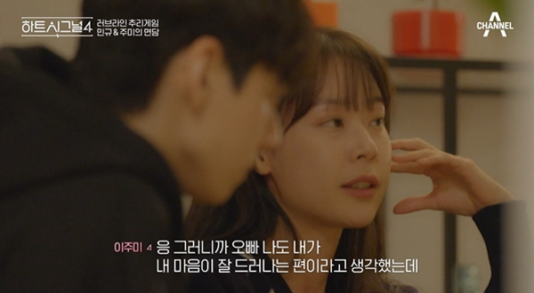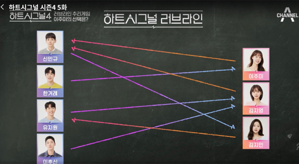 [엔터미디어=정덕현] 모든 관계가 꼬여버렸다. 어디서부터 풀어야 할지 알 수 없을 만큼 마음은 엇갈렸고, 감정들은 복잡해졌다. 함께 지낸 지 벌써 일주일이 지난 상황, 채널A 예능 <하트시그널4>가 보여준 러브라인의 화살표들은 단 하나도 쌍방향을 향한 게 없다. 이주미와 김지영이 신민규에게 화살표를 보냈지만, 신민규는 김지민에게 화살표를 날렸고, 유지원과 이후신이 김지영에게 화살표를 보냈지만, 김지영의 화살표는 신민규로 향했다. 그리고 한겨레는 신민규에게 화살표를 보낸 이주미를 택했다.
