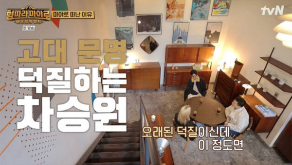 <형따라 마야로>에 대한 세간의 기대가 커진 것은 약 3주 전 나영석 사단의 유튜브 채널 <채널 십오야>의 ‘나불나불’ 코너에 오랜만에 차승원이 얼굴을 비추면서다. 역시나 독특하면서도 재밌는 입담과 라이프스타일을 가진 캐릭터임을 자연스러운 자리에서도 보여줬는데, 여기다 해박한 지식과 관심을 품고 산 고대사 덕후라는 새로운 면모가 더해져 흥미를 자아냈다. ‘나불나불’에서와 마찬가지로 1화 초반, 방글이PD와의 첫 만남 자리에서 쏟아낸 차승원의 고대사에 대한 애정과 지식은 제작진을 현혹시킨 것은 물론 시청자들의 관심을 사기에 충분했다.