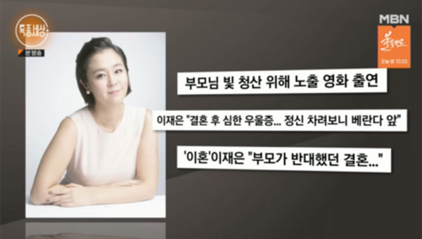 지난번에 tvN <데블스 플랜>을 다뤘을 때 서동주가 모친에게서 분리되길 바란다고 했다. 그런데 얼마 전 더 심한 경우를 봤다. MBN <특종 세상> 604화 배우 이재은 편. 이재은이 재혼을 해서 잘 살고 있었다. 늦게나마 바라던 아기를 낳아서, 육아 자체는 힘들겠지만 평범한 일상 속에서 행복을 찾아가는 중이었다. 그런데 이날 어머니가 등장한다. 10대였던 딸을 성인물 <노란 머리>에 출연시켰던 바로 그 어머니가. 당시 부모 빚 갚고자 19금에 출연했다는 소리가 돌긴 했다. 이번 방송을 보니 사실이었다. 이재은이 담담히 털어 놓기를 영화 한 편이면 아버지 부채를 다 탕감할 수 있다고 해서 영화에 출연했던 거라나. 아역 배우로 활동하면서 CF를 수없이 많이 찍었다는데 그 돈을 부모가 다 없앤 모양이다.