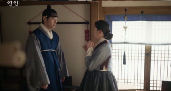 <연인>은 병자호란 당시 청나라에 끌려갔다 살아 돌아온 이른바 ‘환향녀’라 손가락질 당하던 여인들에 대한 이야기를 담고 있다. 원리주의적이고 보수적인 유교관의 생각에 갇혀 있는 연준의 이런 확고한 태도는, 그러나 은애 역시 그런 일을 당할 뻔 했다는 사실을 마주하고는 충격과 절망감에 흔들리게 된다. 그는 은애를 사랑하지만, 자신이 갇혀 있는 생각 때문에 예전처럼 아내를 대하지 못한다. 대신 그 분노는 엉뚱한 곳을 향한다.
