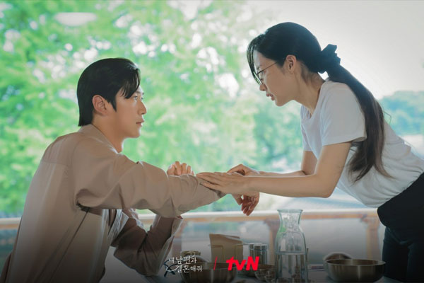 [엔터미디어=정덕현] <재벌집 막내아들>의 여성 버전이라고나 할까. tvN 월화드라마 <내 남편과 결혼해줘>는 절친과 남편의 불륜도 모자라 그들에게 살해당한 강지원(박민영)의 인생 2회차를 그리는 회귀물이다. 회귀물의 정석대로 주인공은 첫 회만에 사망하고 다시 10년 전으로 회귀한다. 강지원은 이제 또 한 번 주어진 이 인생 2회차에서 자신을 불운하고 비극으로 몰았던 그 삶에 반격을 가하려 한다. 복수와 성공을 모두 이루려 한다.