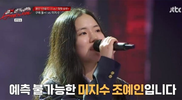 그래서 김담영이 무난하게 첫 번째 맞짱승부에서 승리해 다음 무대로 진출할 거라 여겨졌지만, 스스로의 가능성을 ‘미지수’라 부른 조예인이 기타를 치며 부르는 무대는 이런 예상을 모두 깨버렸다. 오디션 심사계의 ‘시조새’로 불리는 윤종신 심사위원이 극찬했던 것처럼 조예인의 목소리 톤은 독보적이었고, 중저음에서 고음까지 자유자재로 넘나들며 진성과 가성의 중간 정도를 내는 데서 나오는 공명감의 조절은 기가막혔다. 걸그룹? 이건 거의 보컬리스트를 뽑는 오디션에 가까웠다.