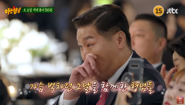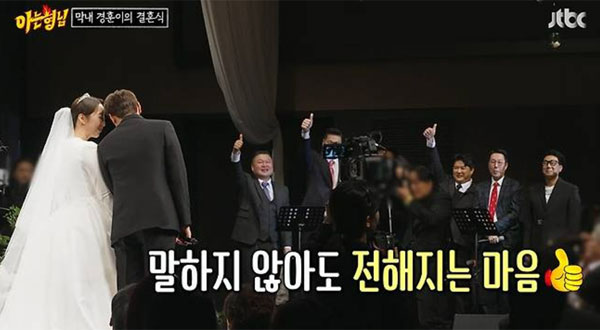 그런데 어떤 드라마보다 더 드라마 같은 장면이 지난주 JTBC 예능 <아는 형님>에서 펼쳐졌다. 막내 민경훈의 결혼을 앞두고 축가 연습 과정과 결혼식 당일에 축가를 부르는 장면을 보여줬는데 솔직히 별 기대감이 없었다. 제작진이 ‘결혼식으로 한 주 때울 수 있게 됐네, 아싸!’ 뭐 이럴 거 같지 뭔가. 그런데 웬걸, 진심으로 감동했다. 주례 없이 신랑 신부가 서로를 향한 마음이 담긴 편지를 읽었는데 필설로 표현이 아니 된다. 숱하게 많은 결혼식을 봐왔지만 이처럼 신랑신부로 인해 가슴이 찡한 적은 처음이었으니까.