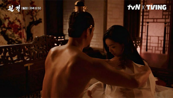 따라서 사실 <원경>은 그다지 역사왜곡이라는 논란에서는 비껴나 있는 작품이라고 볼 수 있다. 하지만 놀라운 건 이 작품이 tvN과 티빙에서 동시에 방영하면서 그 수위를 15세와 19세로 나누는 투 트랙 전략을 썼다는 점이다. 그래서 15세 버전인 tvN에서는 볼 수 없었던 정사신이 19세 버전인 티빙에서는 편집없이 등장한다. 원경과 이방원의 정사신이 그것이다.