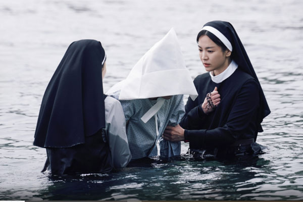 <검은 수녀들>은 마지막 엔딩에 사제복을 입은 강동원이 카메오로 등장하는 것으로 알 수 있듯이 <검은 사제들>의 수녀 버전이라고 해도 될 법하다. 강동원이 사제복을 입은 것만으로도 큰 화제를 불러일으켰던 <검은 사제들>처럼 <검은 수녀들> 역시 수녀복을 입은 송혜교가 단연 화제의 중심이다. 영화가 시작되기 전부터 송혜교의 이례적인 홍보와 거침없는 한 마디 한 마디가 <검은 수녀들>의 기대감이 최고조로 끌어올렸다.