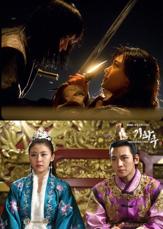 하지만 이런 하지원의 남성적인 움직임은 그녀 연기의 폭을 넓혀주는 무기이지만 동시에 비밀스러운 베일의 역할을 한다. 바로 딱딱한 남성스러운 팔다리의 움직임이 치맛자락과 길게 푼 머리에 가려질 때 여성스러운 매력이 드라마틱하게 피어나기 때문이다. <기황후>에서 승냥이가 당기세에게 여성임을 들키고 여자의 모습으로 나타났을 때가 바로 그런 순간이다. 겨우 몇 분 전까지 보여줬던 남성적인 모습과 대비되면서 다른 여배우들에게 찾아보기 힘든 하지원만의 매력이 극대화된다.