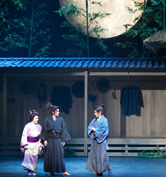 코지로는 목숨을 잃은 것으로 알려져 있지만 작가 이노우에 하사시는 코지로가 살아남았을지도 모른다고 상상하고 글을 써 내려가기 시작했다. 이노우에의 손을 거친 이 작품은 니나가와 연출가 특유의 아름답고 서정적인 무대 미학과 만나 3분 안에 객석을 사로잡게 된다. 무사들의 긴장감 넘치는 결투로 객석을 긴장시키더니, 곧 6년의 시간이 흐른 뒤 어둑한 대나무 숲과 조용한 사찰로 관객을 초대했다. 무대 장치 역시 조용히 자신의 몫을 하고 있다는 듯 ‘스르르’ 떨림을 안기며 등장했다. 주목할 점은 여기까지 이야기가 3분 안에 다 이뤄진다는 점.