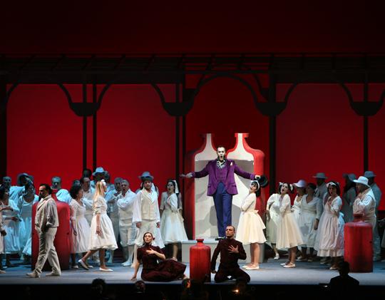 “국내에서 <사랑의 묘약>이 공연 된다고 하면, 늘 전원적이고 목가적인 분위기를 떠 올려요. 그런데 저희는 완전 분위기를 바꿔 재미있는 오페라를 만들고 싶었어요. 무대 한가운데에는 거대한 붉은색 와인 병이 놓여 있고, 미니멀리즘을 기본으로 조명을 극대화 했어요. 처음엔 흰색 의상으로 시작해요. 빛이 바뀌면 다 다르게 보일 수 있도록 말이죠. 주역들은 톡톡 튀는 컬러의 의상을 입긴 해요. 의상과 세트가 일체감 있게 보일 수 있도록 약장수 둘카마라가 나타날 땐 또 의상이 바뀌어요. 색깔로 그 사람의 특징을 표현한다고 볼 수 있죠.