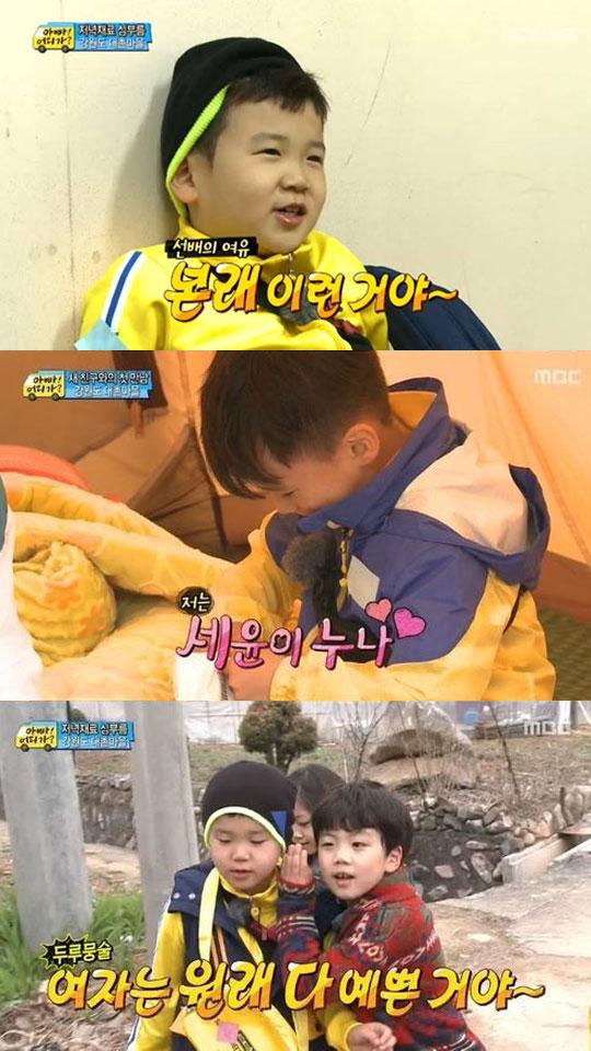 가장 큰 변화를 보인 건 그간 슬럼프에 빠진 듯한 모습을 보이던 <아빠 어디가>의 ‘에이스’ 윤후다. 그간 대장 역할을 맡으며 의젓해진 탓인지 과거의 대체 불가 그만의 어록을 만들어내던 모습과는 사뭇 달랐던 그였다. 하지만 세윤이 들어오자 윤후의 행보가 훨씬 활발해지기 시작했다. 세윤 앞에서 부끄러워하는 모습을 보이더니 세윤이 함께 장보러 갈 사람으로 자신을 선택하자 못들은 척 하며 좋아하는 윤후.