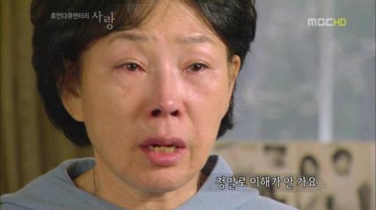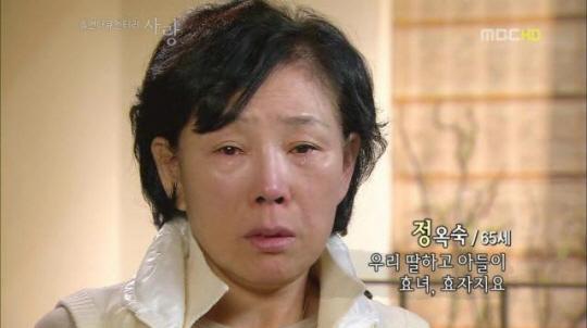 [엔터미디어=정덕현의 스틸컷] 이렇게 고통스런 삶이 있을까. '휴먼다큐 사랑'에 얼굴을 보인 고 최진실씨의 엄마 정옥숙씨. 힘겨운 결혼생활에 논일, 밭일, 뜨개질, 외판원, 심지어 포장마차까지 하며 살아보려 했지만 도무지 출구가 보이지 않아 스스로도 죽자 결심을 했던 그녀. 그 때 그녀의 손을 잡아준 건 어린 최진실의 손이었다. 최진실은 훗날 한 인터뷰를 통해 그 때 가장 힘들었던 건 가난이 아니라, "이러다 엄마가 떠나버리면 어쩌지" 하는 불안감이었다고 술회했다.