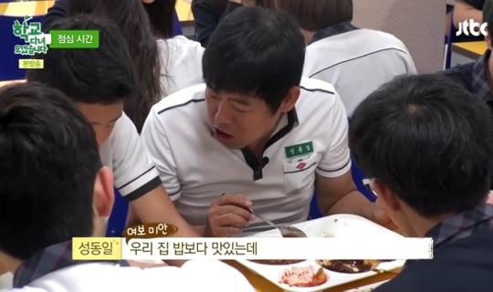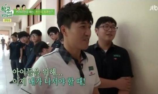 JTBC의 새로운 토요예능 <학교 다녀오겠습니다>는 ‘성인이 되어(혹은 내가 만약) 다시 학교에 간다면’이란 상상을 예능화한 버전이다. 40대 후반의 성동일부터 40대 로커 윤도현, 예능인 김종민과 캐나다 출신 브라이언, 20대 초반의 강준, 남주혁과 현직 아이돌 허가윤까지 다양한 연령층의 연예인들이 교복에 학생증까지 발급받고 다시 학교를 찾아간다. 단순히 체험하는 수준이 아니다. <진짜 사나이>의 군대도 방송을 위한 이벤트로 흘러가지만 타이트한 시간표와 준엄한 종소리에 철저히 지배되는 학교에서는 그런 게 없다. 학교생활의 대부분을 차지하는 45분간의 수업시간에는 그 어떤 예능의 설정도 불허 되는 신성불가침의 영역이기 때문이다.