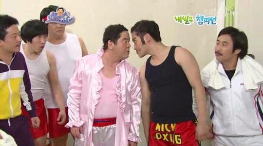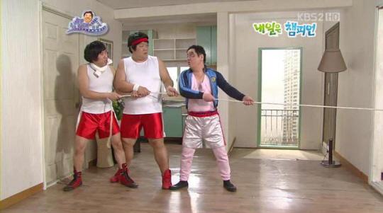 [정덕현의 스틸컷] "야 김관장. 옛날에도 별 볼 일 없더니 아직도 이렇게 칙칙한 곳에서 생활하나? 어?" '심형래쇼'에서 과거 심형래가 했던 '내일은 챔피언'을 재연하는데, 김병만이 경쟁 도장 관장으로 출연한다. 김병만은 "외국에서 아주 좋은 물건을 하나 가져왔다"며 스파링을 제안한다. 스파링 상대는 다름 아닌 내복이(내복을 입고 있다), 심형래다. 나이트 가운을 입고 등장한 심형래는 슬랙스틱의 고수답게 연실 맞고 깨지고 넘어지면서 본능적인 웃음을 자극한다. 심형래식의 몸 개그가 '개그콘서트'와 만나는 순간이다.