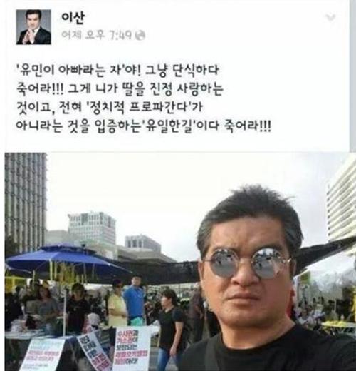 그런데 정대용이 30년 배우 인생을 끝내겠다고까지 사죄를 하고 있는 와중에 정작 이 문제의 글을 올린(그것도 한 번도 아니고 반복적으로) 이산(본명 이용근)은 아무런 행보도 보이고 있지 않다는 점이 의문스럽다. 정대용이 남긴 댓글보다 그 댓글이 달린 이산의 글은 제 아무리 정치적 입장이 다르다고 해도 인간으로서는 함부로 입에 달 수 없는 말들이다. ‘유민이 아빠라는 자야, 그냥 단식하다 죽어라. 그게 딸을 진정 사랑하는 것이고, 전혀 정치적 프로파간다가 아니라는 것을 입증하는 유일한 길이다. 죽어라.’ 이게 상식이 있는 사람이 할 수 있는 말인가.