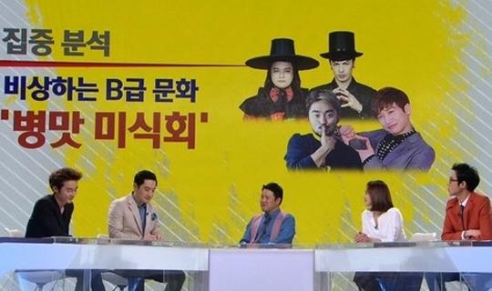 그런데 어느 순간 1부와 달리 ‘수다’와 ‘비평’을 동시에 버렸다. 처음에는 분석하거나 호불호를 밝히는 거나 이슈를 언급하면서 시청자들과 눈높이를 맞췄다. 그런데, 봉해지거나 약해진 혀들은 피하거나 질문만 늘어놓기 시작했다. 이번 주 주제였던 ‘B급 정서’에 관한 분석은 사실 <라디오스타>가 게스트 조합할 때 이름 짓는 ‘무슨 무슨 특집’ 수준에 지나지 않았다. 도입만 그럴듯하게 했을 뿐 노라조와 배우 이용녀를 스튜디오에 모시기 위한 인사말에 가까운 장치였다.