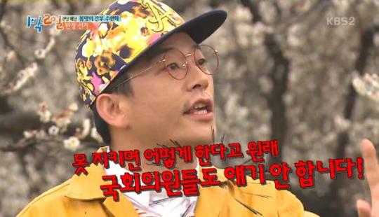 땅끝마을 해남으로 떠난 <1박2일>은 ‘봄맞이 간부수련회 특집’이라는 타이틀을 붙였다. 보통의 경우였다면 ‘봄맞이’ 정도가 지금껏 해왔던 <1박2일>의 특집이었을 게다. 하지만 <1박2일>은 여기에 ‘간부수련회’라는 새로운 아이템을 집어넣었다. 그리고 오프닝에 선거철을 맞아 갖가지 선거 행태를 풍자하는 ‘반장 선거’, ‘회장 선거’, ‘왕 선거’, ‘짱 선거’ 같은 걸 집어넣었다. 선거를 풍자하면서 그 과정에서 생기는 서열구조를 통해 자연스럽게 웃기는 상황극들이 만들어졌다.
